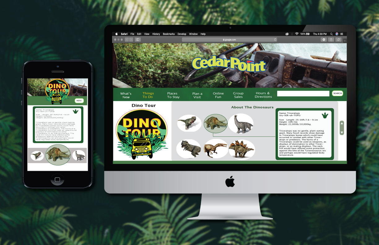 Stoopid Pig Records is a record label out of Boston. They sign groovy alternative bands and indie punk outfits. Shown is a logo and promotional sticker set. Dino Tour – Dino Tour is an interactive animatronic ride found in Cedar Point Park. Riders are treated to a slow ride through a jungle setting with action packed dinosaur animatronics, all with audio commentary. Shown is an interactive website describing the ride.
