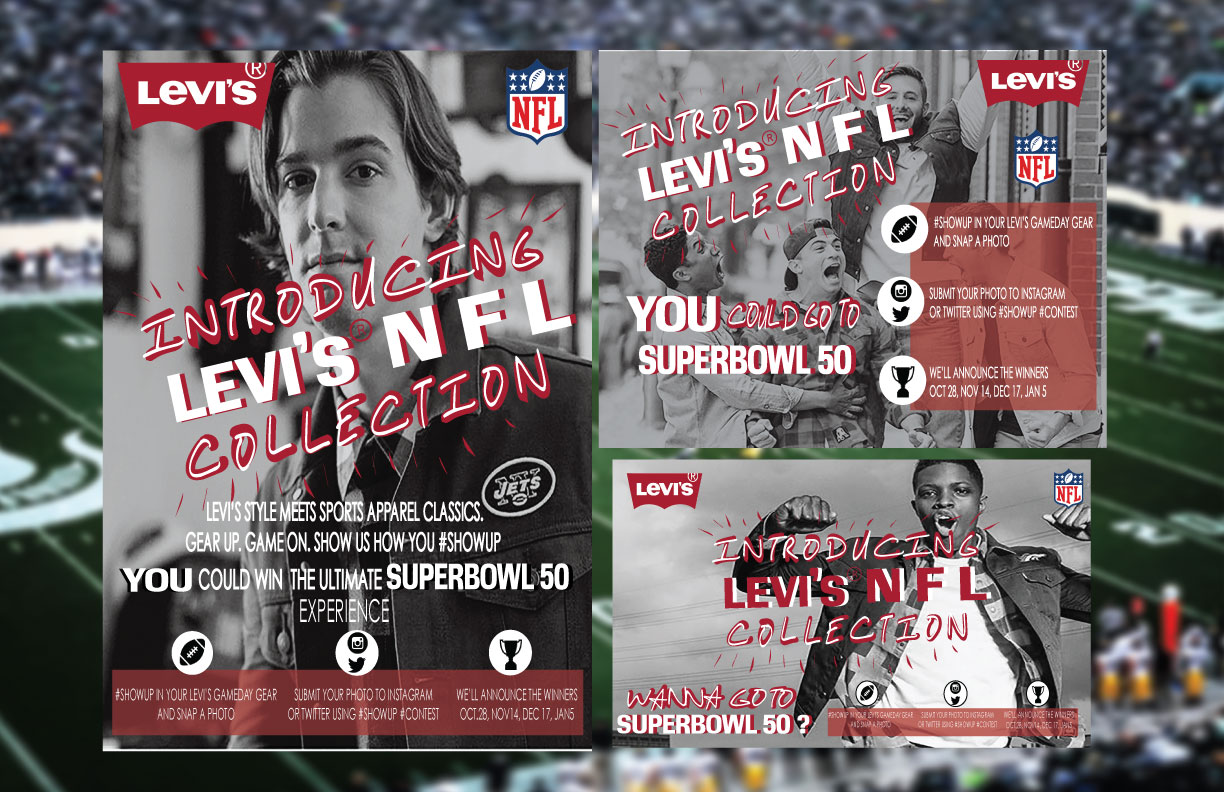 George’s Surf ‘N Turf is a New England treat! Fried seafood, burgers, hotdogs, and ice cream. Outdoor seating and carhop service! Shown is the new website. Levi’s Print Ads – In 2016 Levi’s launched a line of NFL branded clothing such as jackets, flannel shirts, and t-shirts. I created a promotion to tie on to their new NFL clothing line. Buy the gear, take a photo, upload it to social media with a specific hashtag, win tickets to Super Bowl 50. Shown is a full page ad, a half page ad, and a quarter page ad. Paradigm Southern Style Cuisine –